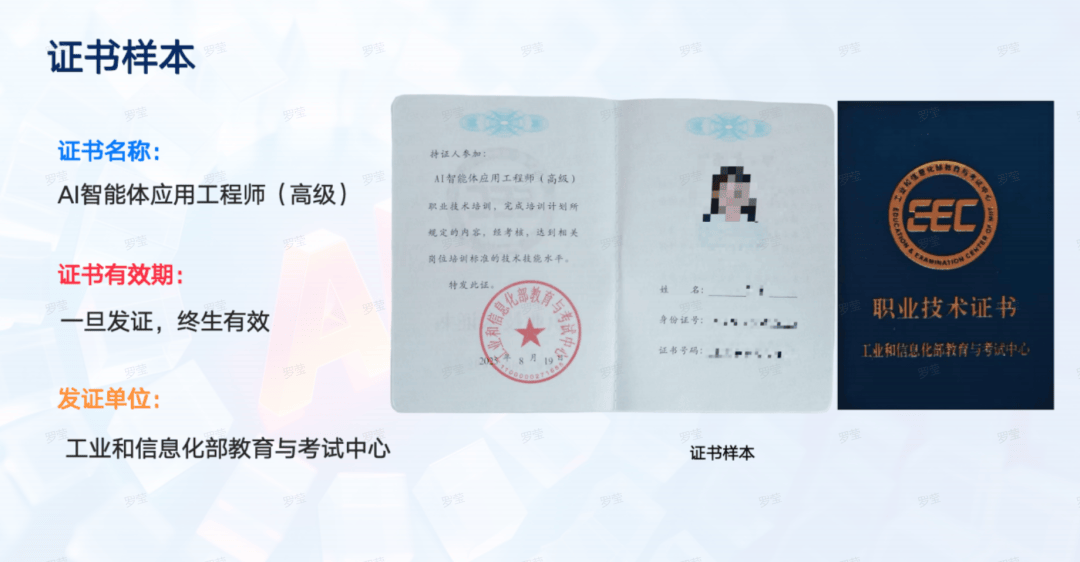 趋向盈利:2027年智能体使用普及率将超70%,(来历:脉脉高聘发布的《2025 年度人才迁移演讲》)职业前景/小我成长:AI智能体是当前AI范畴主要的趋向之一,职称评定辅帮材料,官网可查独一编号。智能体工程师薪资较保守手艺岗超出跨越35%以上,费用可不雅;这套“手艺 + 认证 + 资本”的组合拳,辞别“沉理论轻实践”,持证者的能力更容易被企业承认,国度认证:工业和消息化部曲属事业单元颁布,官网可查独一编号。小我无机会凭仗技术开展贸易化摸索 —— 为各行各业供给定制化AI东西,既能矫捷阐扬本身最大价值,但当前120万人才缺口下,岗亭需求持续增加。添加额外收入;都能帮你快速入局AI赛道。企业需求大量增加,帮帮培育更多具备AI智能体搭建能力。